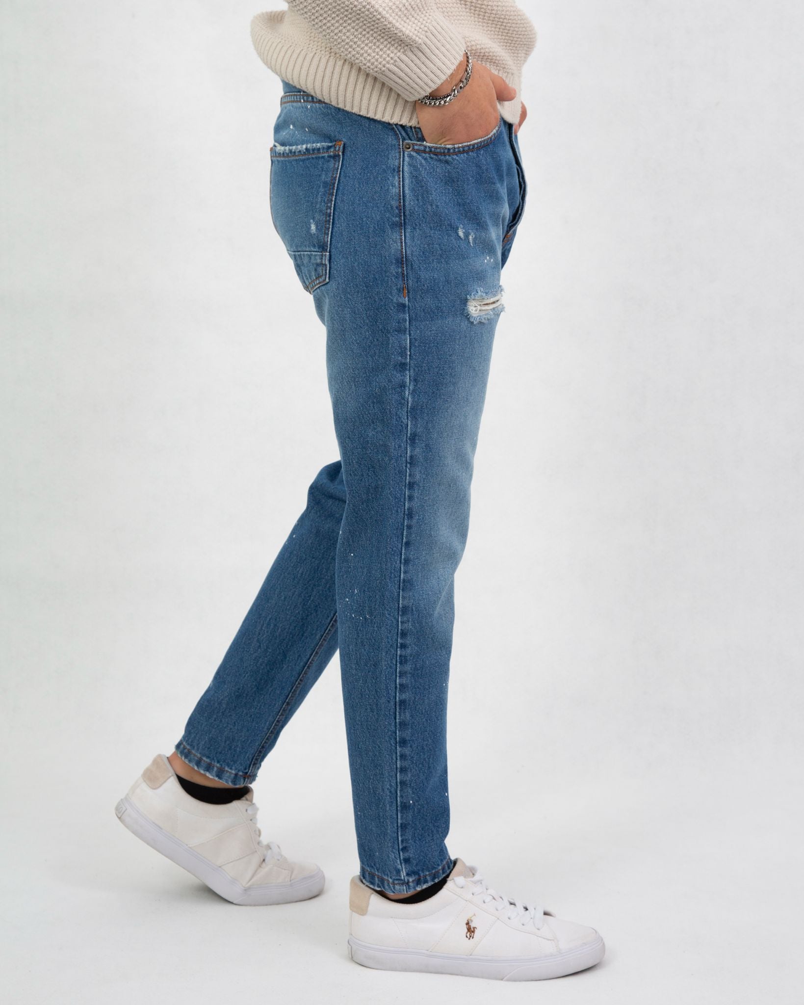 La vestibilità loose fit garantisce massimo comfort e un look rilassato, mentre la lunghezza alla caviglia dona un tocco contemporaneo e versatile. Dettaglio esclusivo? Gli schizzi di pittura a mano, che rendono ogni pezzo unico e irripetibile.