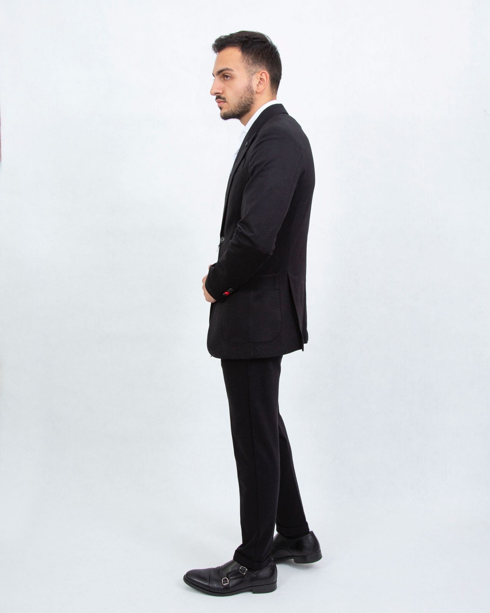 La giacca monopetto presenta una linea pulita, bottoni tono su tono e tasche applicate per un look fresco e sofisticato. Il pantalone coordinato ha una vestibilità slim e una caduta pulita, ideale per valorizzare la figura mantenendo libertà di movimento.