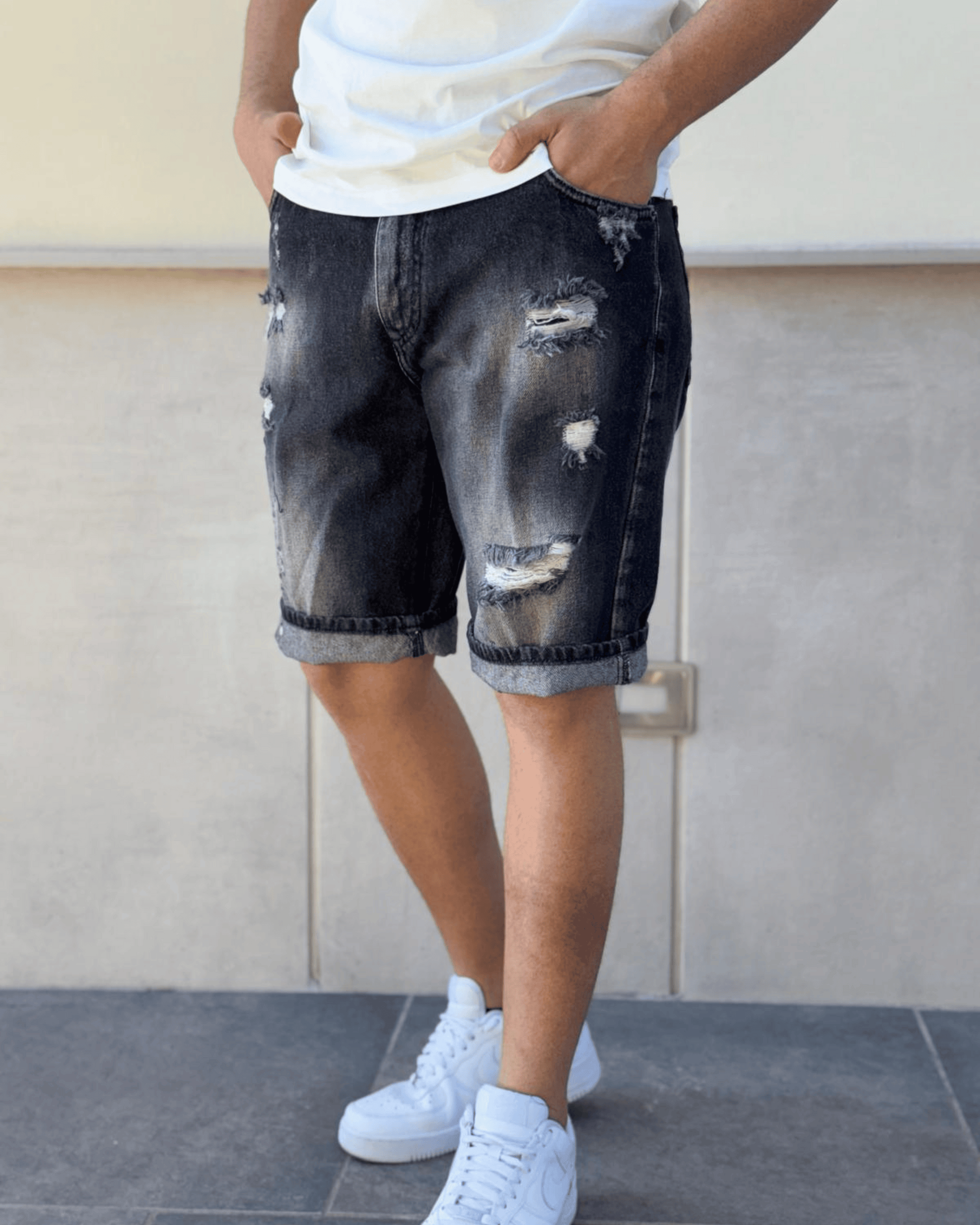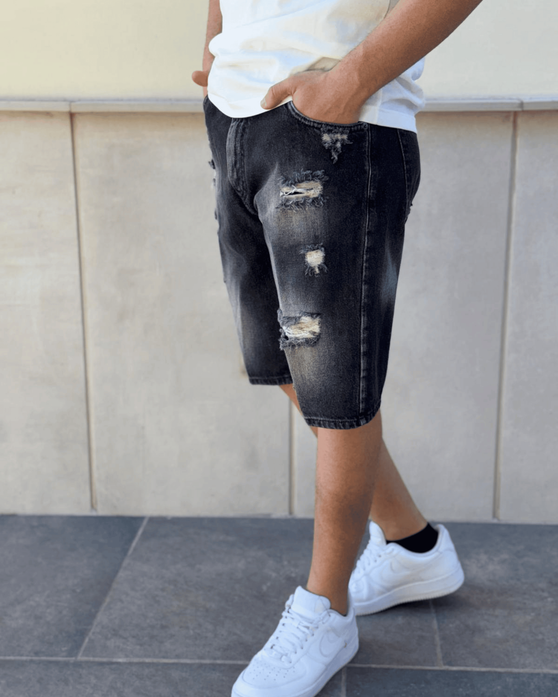 Questi bermuda in denim uniscono uno stile deciso a una vestibilità rilassata, perfetti per le giornate più dinamiche. Il lavaggio scuro è arricchito da rotture strategiche e leggere scoloriture, per un effetto vissuto ma curato nei dettagli. Il taglio sopra il ginocchio garantisce libertà di movimento senza rinunciare allo stile.