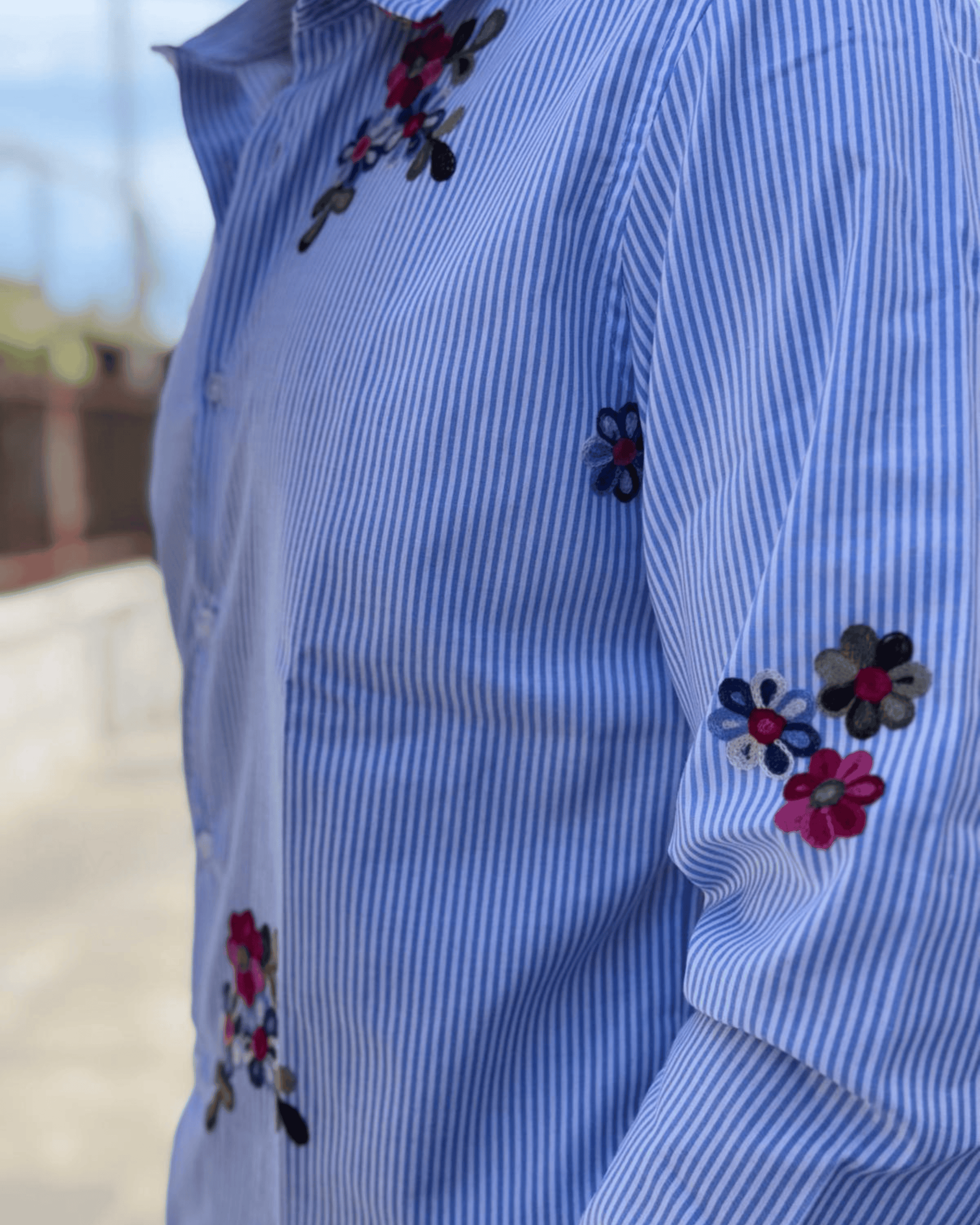 Realizzata in morbido cotone traspirante, la camicia Kos presenta un'elegante rigatura blu su base bianca, impreziosita da ricami floreali colorati che aggiungono un tocco inaspettato e raffinato. Il design unisce la freschezza della stagione ai dettagli che fanno la differenza.