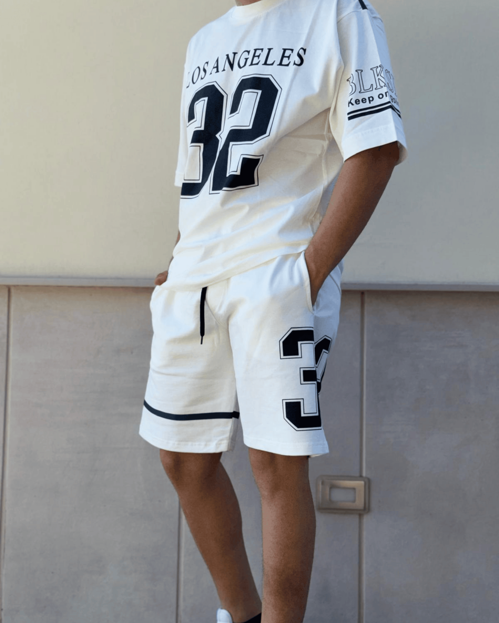 Il completo Los Angeles unisce il meglio del design streetwear con una combinazione di colori elegante e versatile. La maglia bianca con dettagli neri e il bermuda bianco con accenti neri creano un look moderno e dinamico, perfetto per ogni occasione casual.