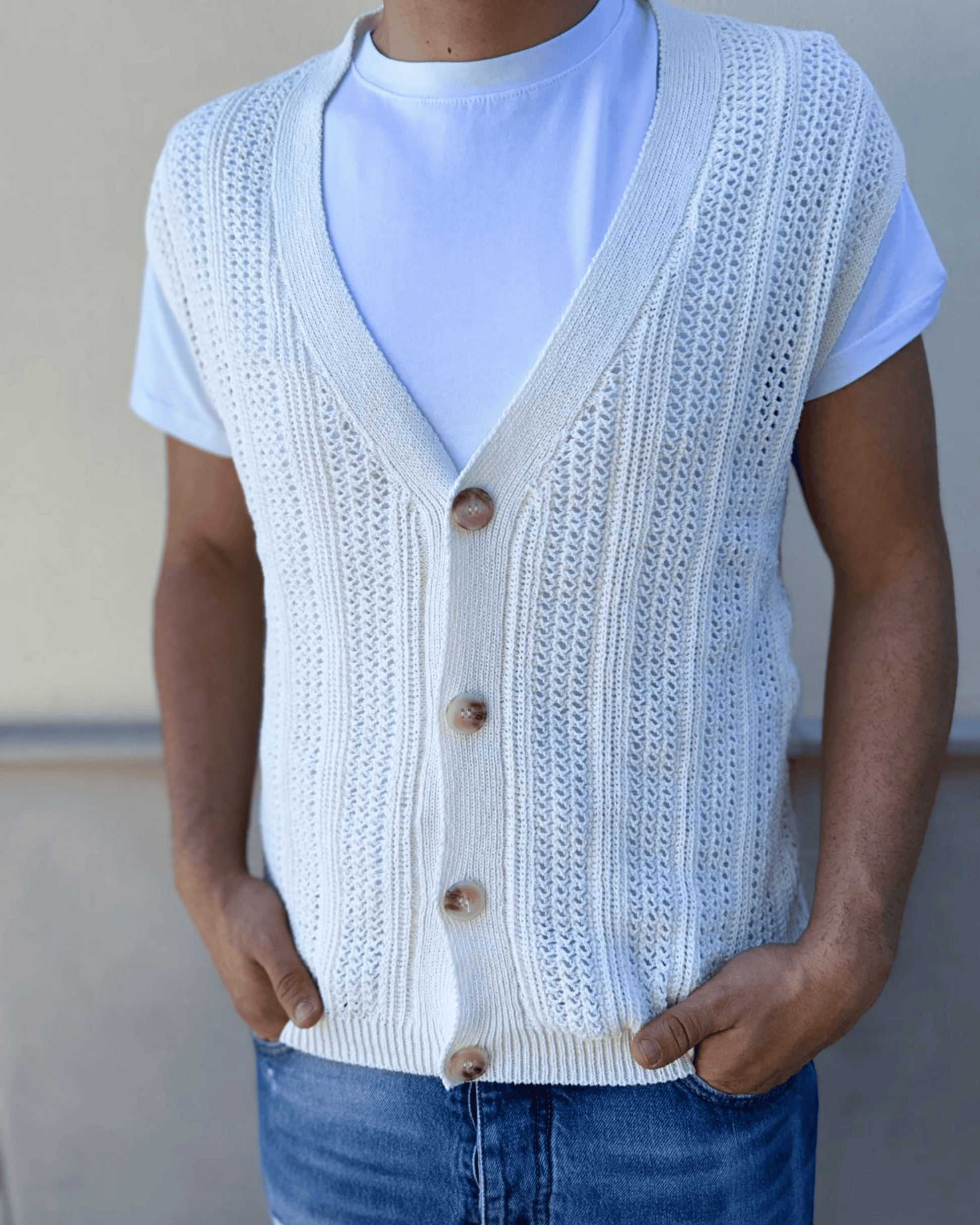 Questo gilet traforato color panna è il capo ideale per completare un look estivo con classe e freschezza. Senza maniche e con lavorazione traforata, lascia traspirare la pelle pur mantenendo uno stile curato. I bottoni frontali aggiungono un tocco classico, rendendolo perfetto sia sopra una t-shirt che a pelle per un look più audace.