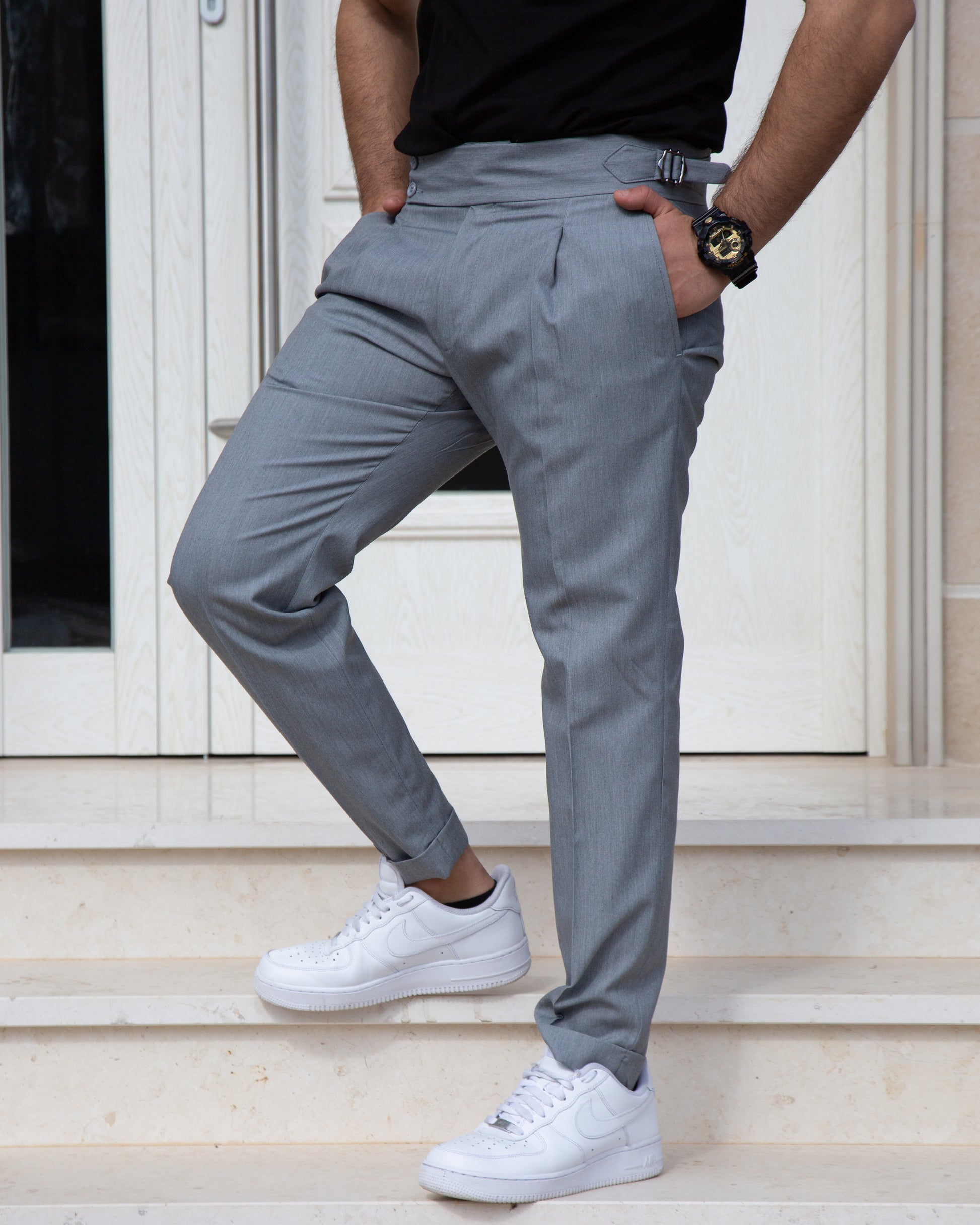 La fascia a bottoni in vita dona struttura e carattere, mentre il taglio pulito assicura un look impeccabile in ogni occasione.